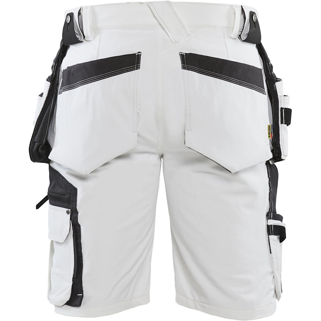 Soepele werkshorts met in vier richtingen rekbare stof, bestand tegen zware klussen terwijl je niets inlevert aan pasvorm en draagcomfort. De wit/grijze kleurstelling en speciale zakken voor kwasten, borstels en plamuurmessen maakt hem met name geschikt voor schilders en stukadoors.