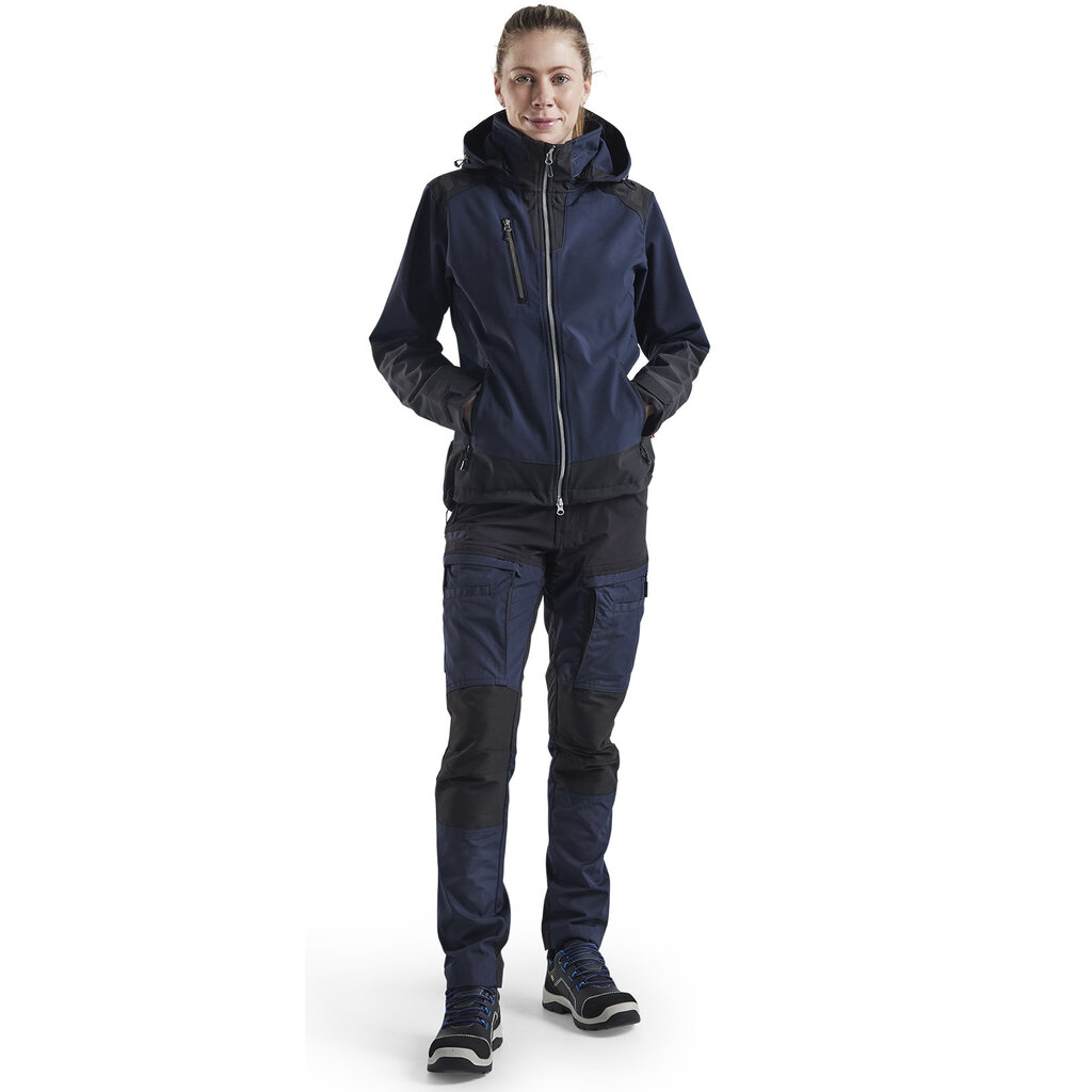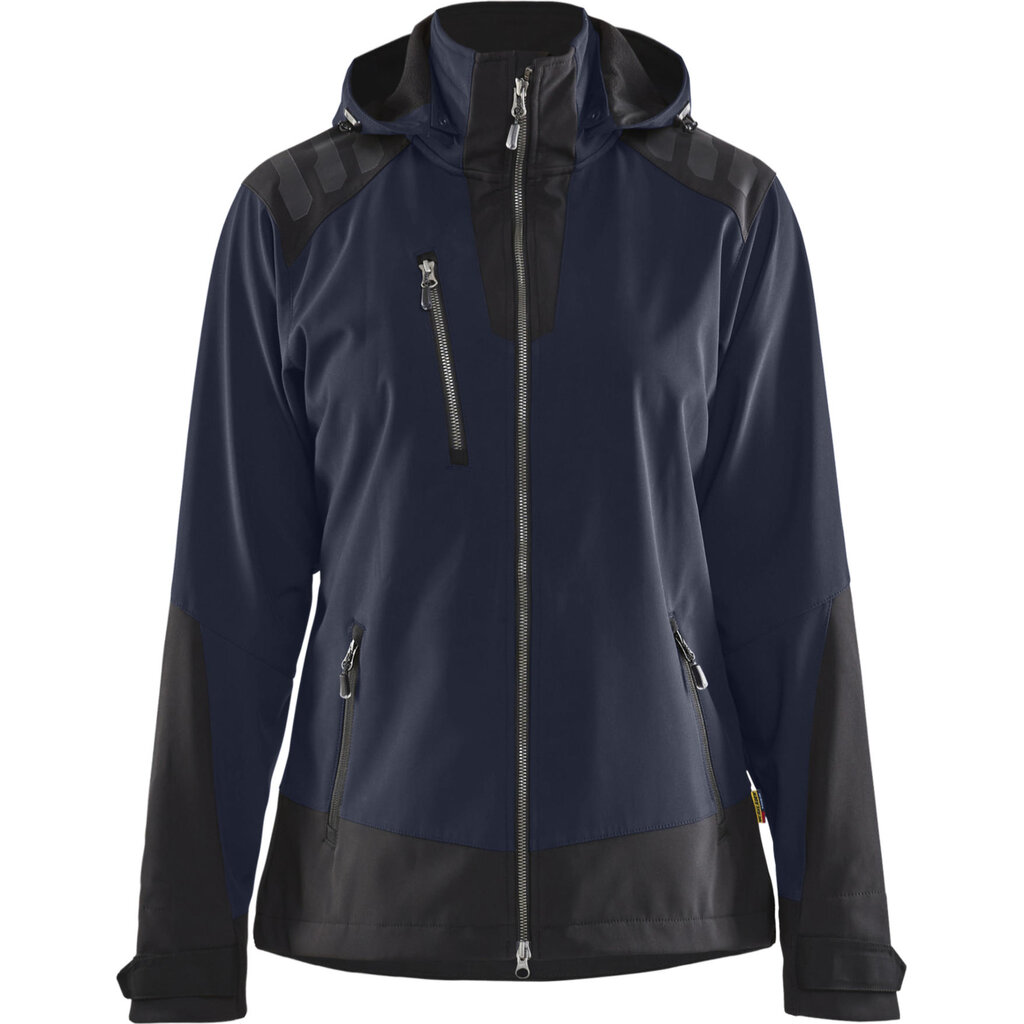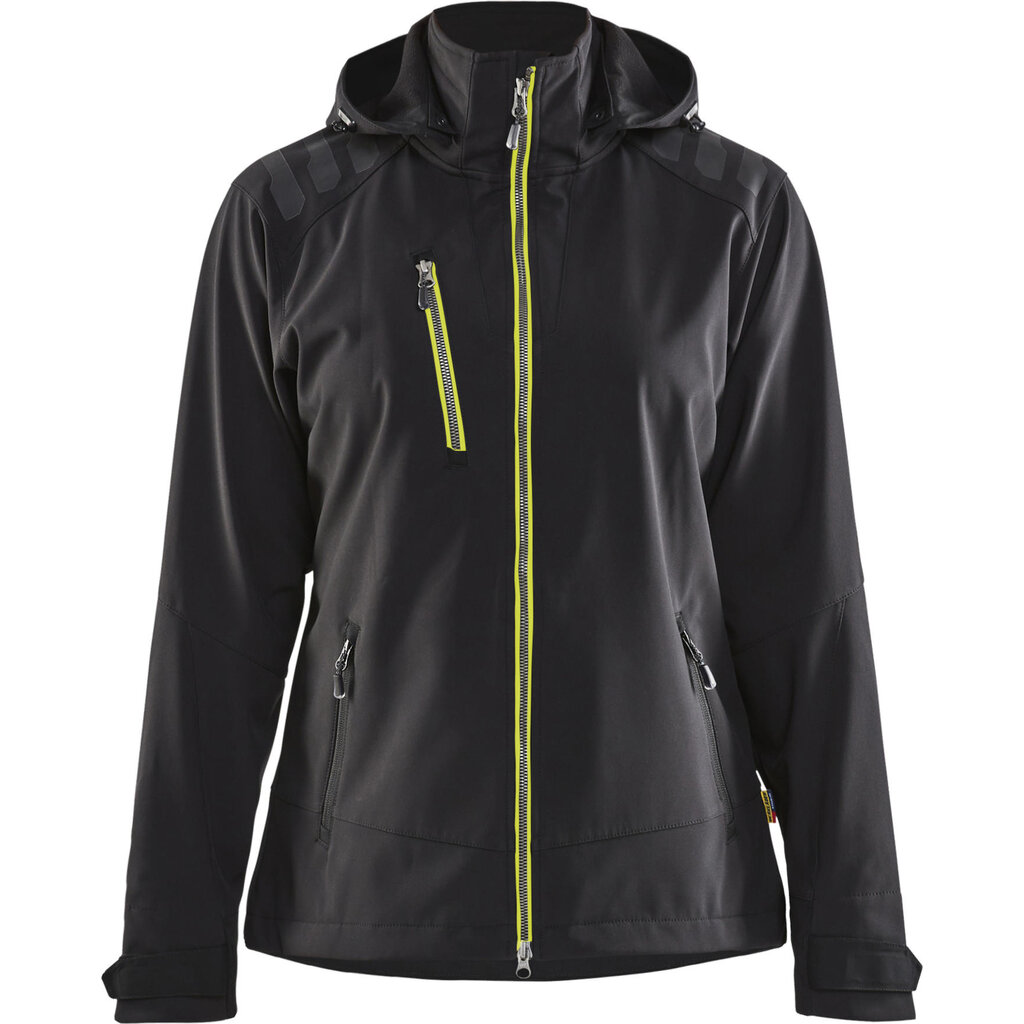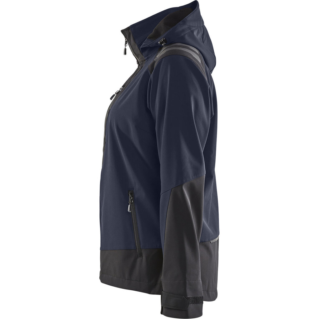 Veelzijdig softshelljack voor dames met een verstelbare capuchon en discrete (donkergekleurde) reflectoren op de schouders en rug.