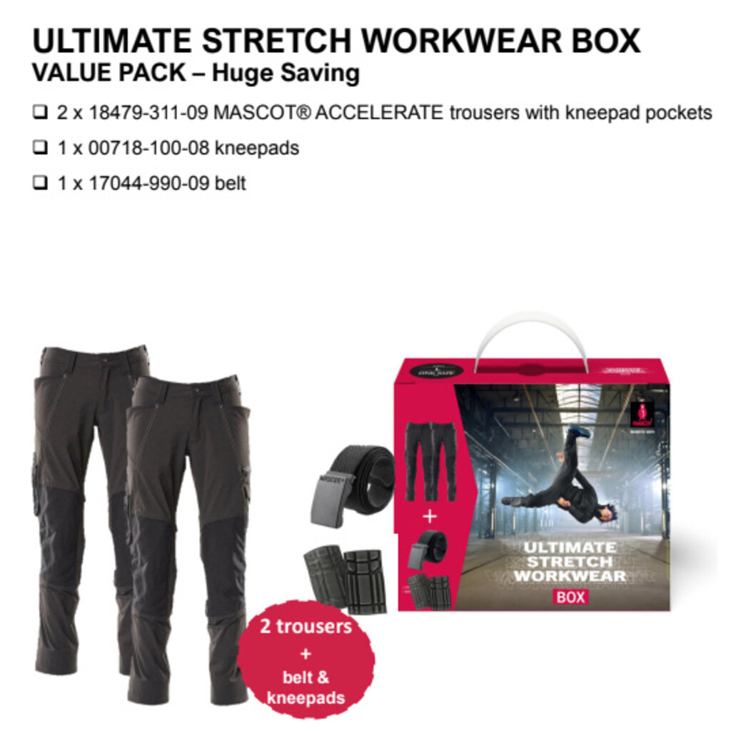 Gratis kniebeschermers en riem bij aankoop van twee van deze Accelerate werkbroeken! Geldig zolang de voorraad strekt.