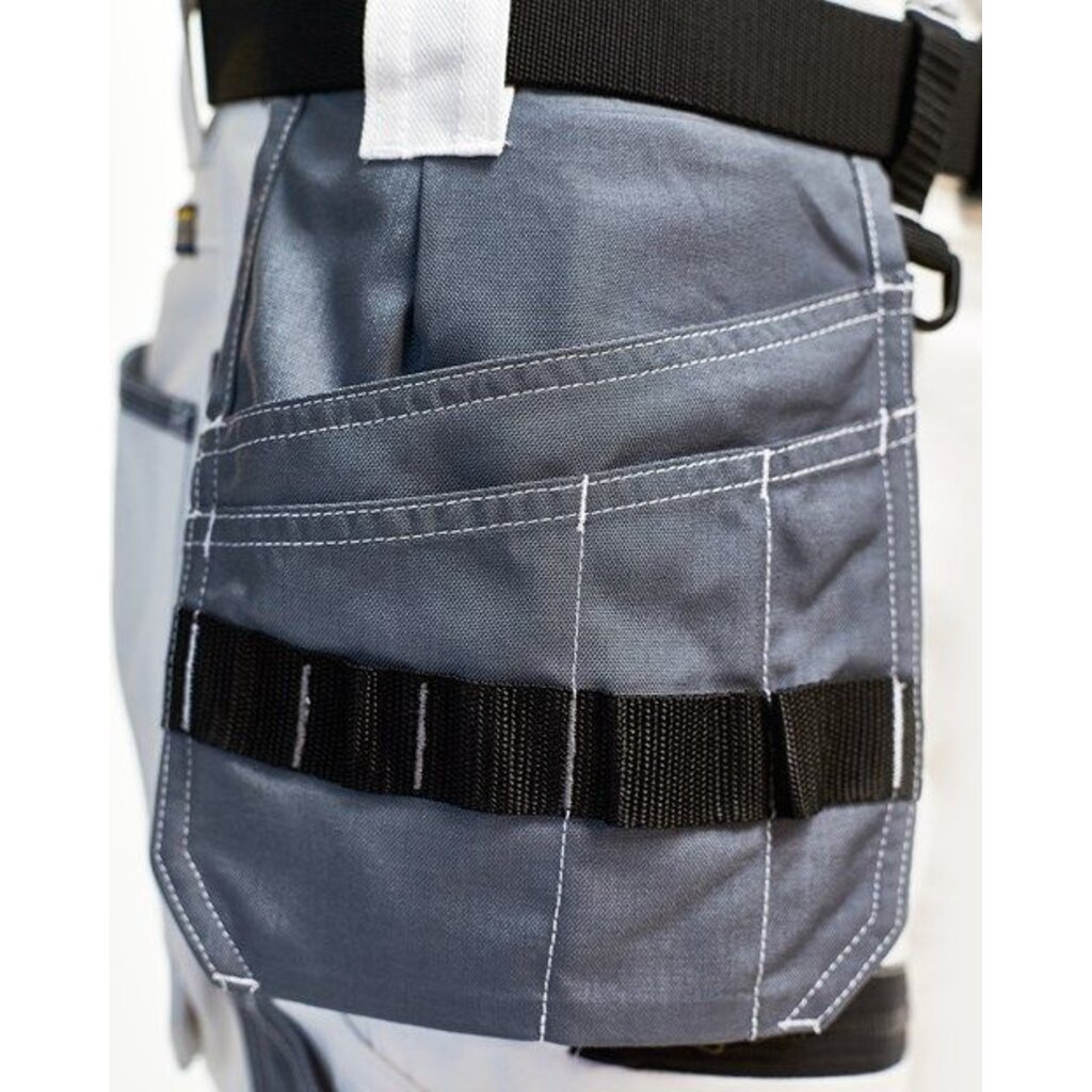 - Zakken: Achterzakken, beenzak voor plamuurmes en borstel, zak met rits op bovenbeen, beenzak met ritssluiting, pennenzak en binnenzak voor telefoon, dijbeenzak met rits, insteekzakken, spijkerzakken.