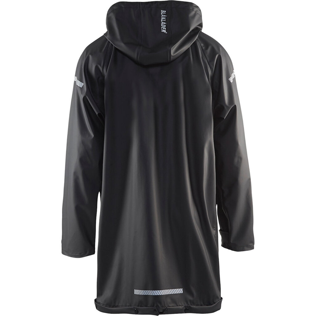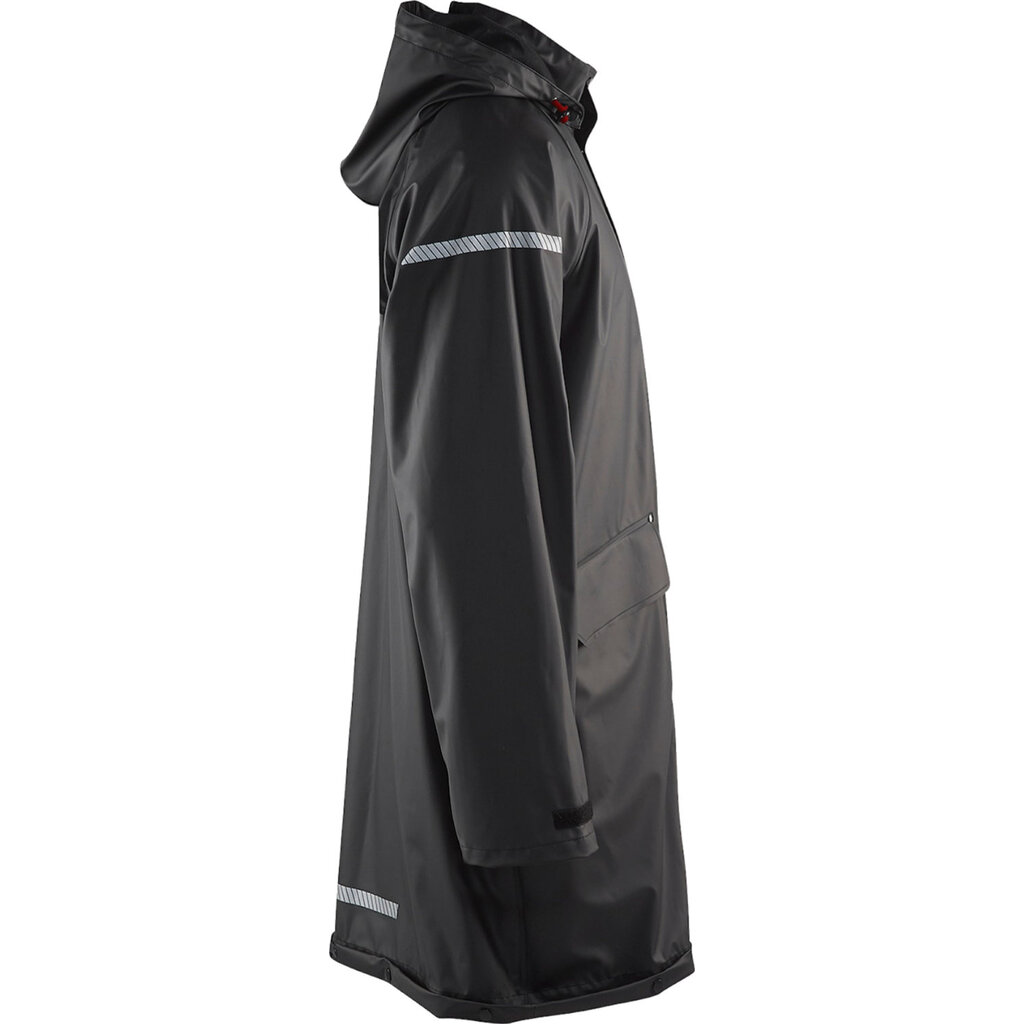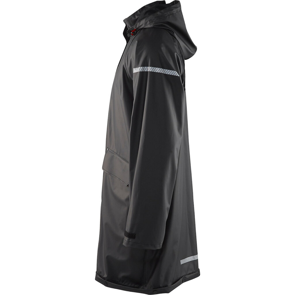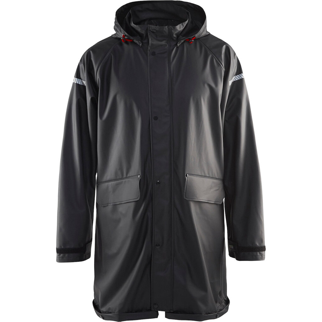 Topkwaliteit regenkleding van 100% polyester, PU-coated. Voorzien van een stevige ritssluiting, verstelbare polsmanchetten en handige regengoot onderaan de jas. Ventilatie in de oksels en een afneembare capuchon. Op voor- en achterzijde voorzien van een reflecterende strip voor goede zichtbaarheid tijdens de zwaarste omstandigheden.