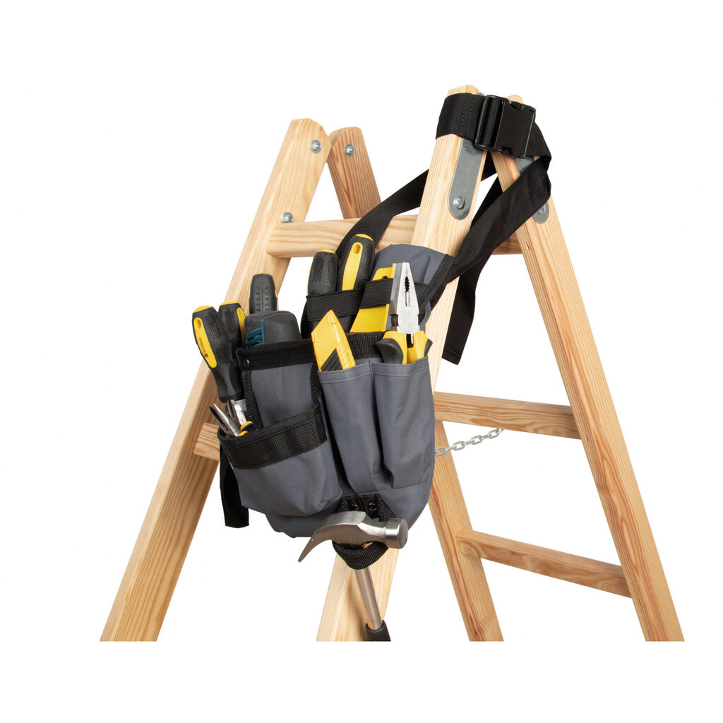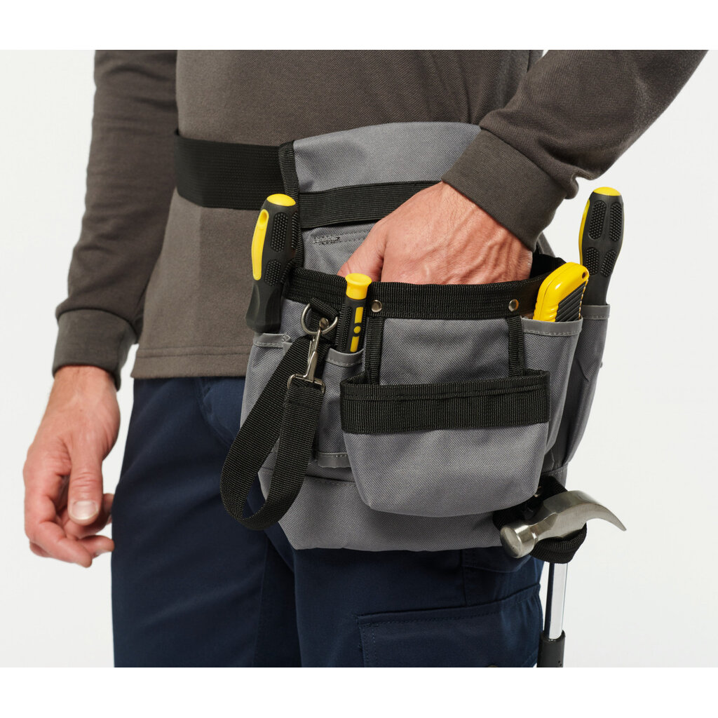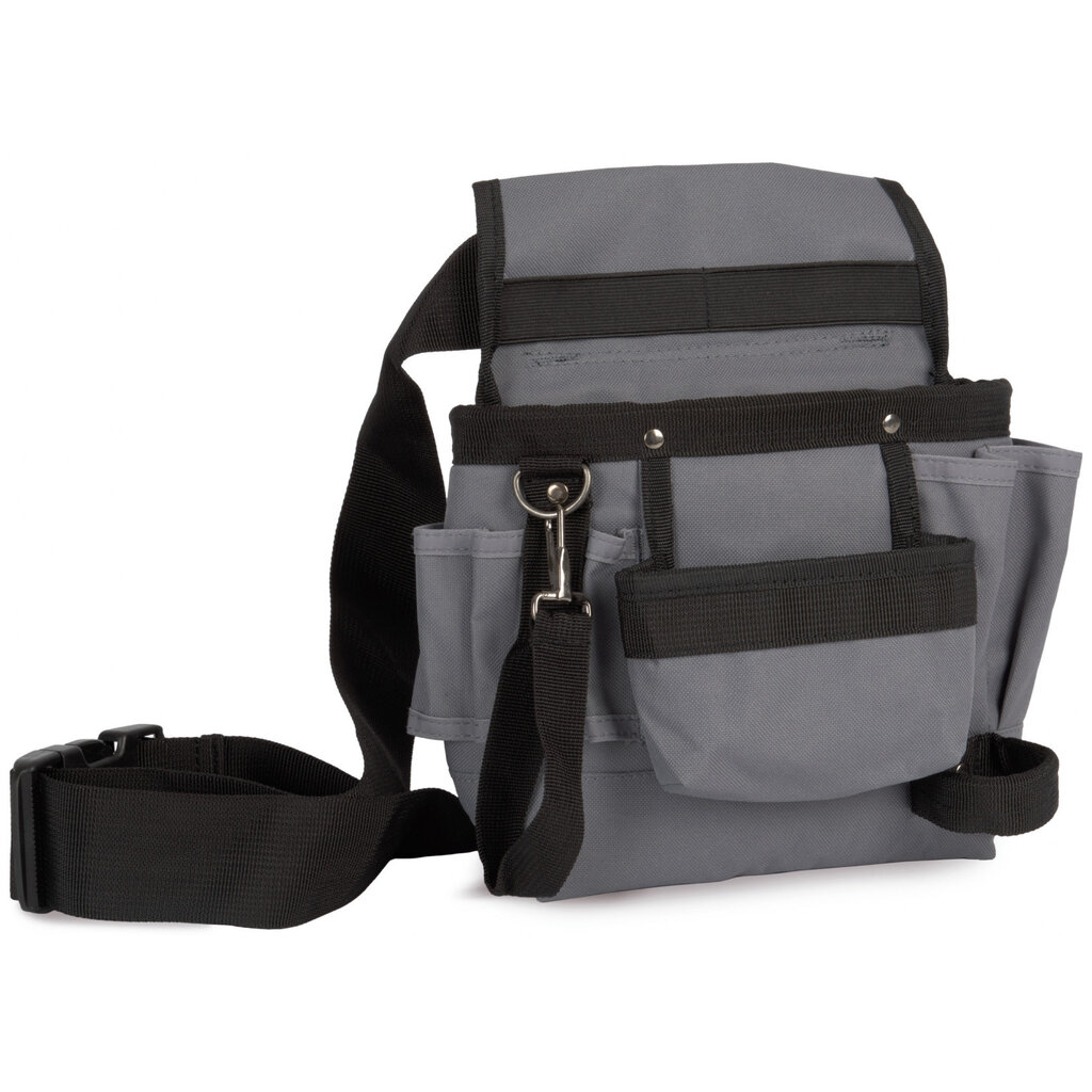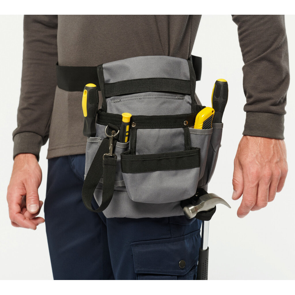 Met deze bijzonder functionele gereedschapstas, die bezit over 8 verschillende vakken en een plakbandhouder, heb jij alle benodigde tools altijd binnen handbereik. De bijbehorende riem is verstelbaar en voorzien van een gesp, zodat je niet alleen geordend maar ook comfortabel aan het werk kunt. Op de open zak aan de voorkant is ruimte voor personalisatie. Gemaakt van 100% polyester.