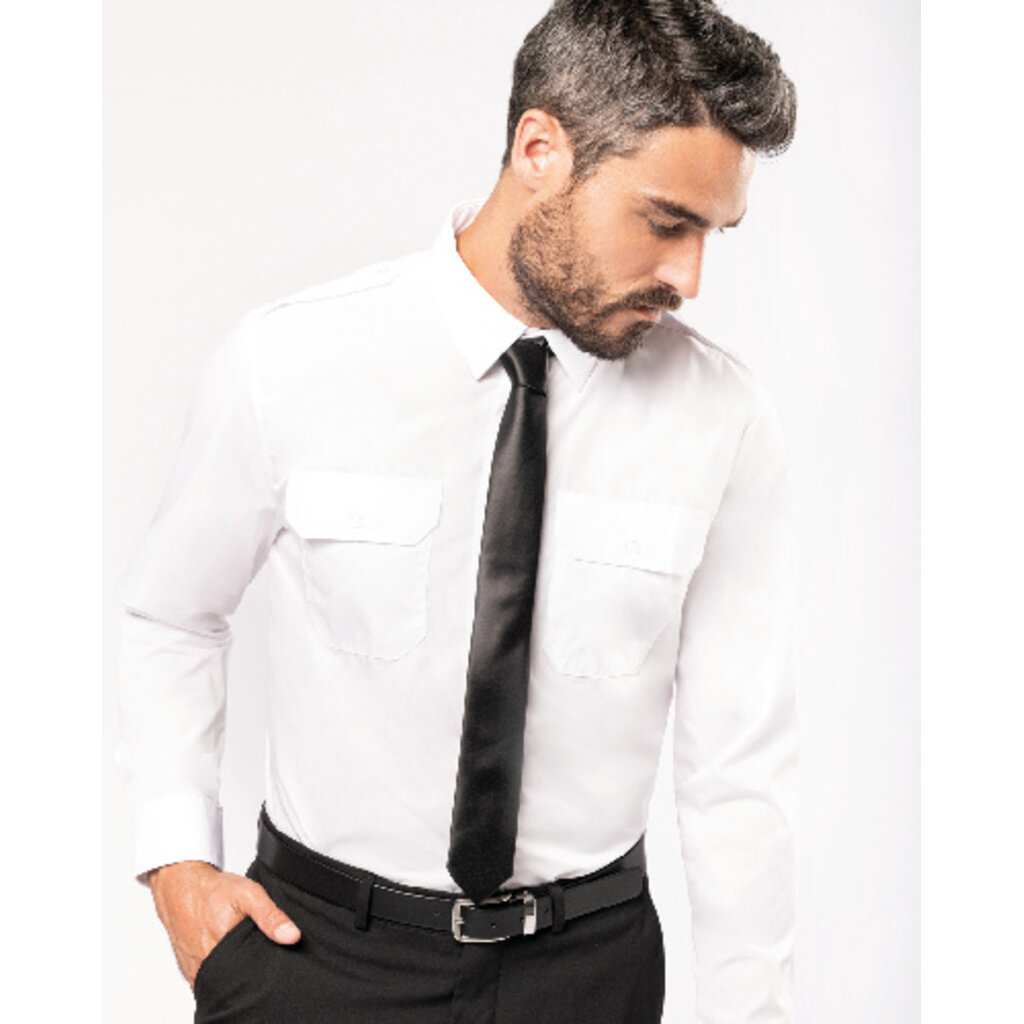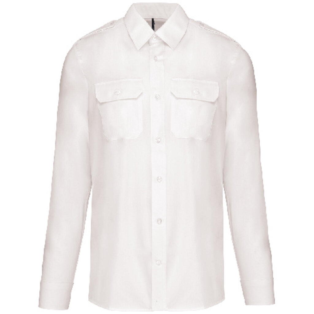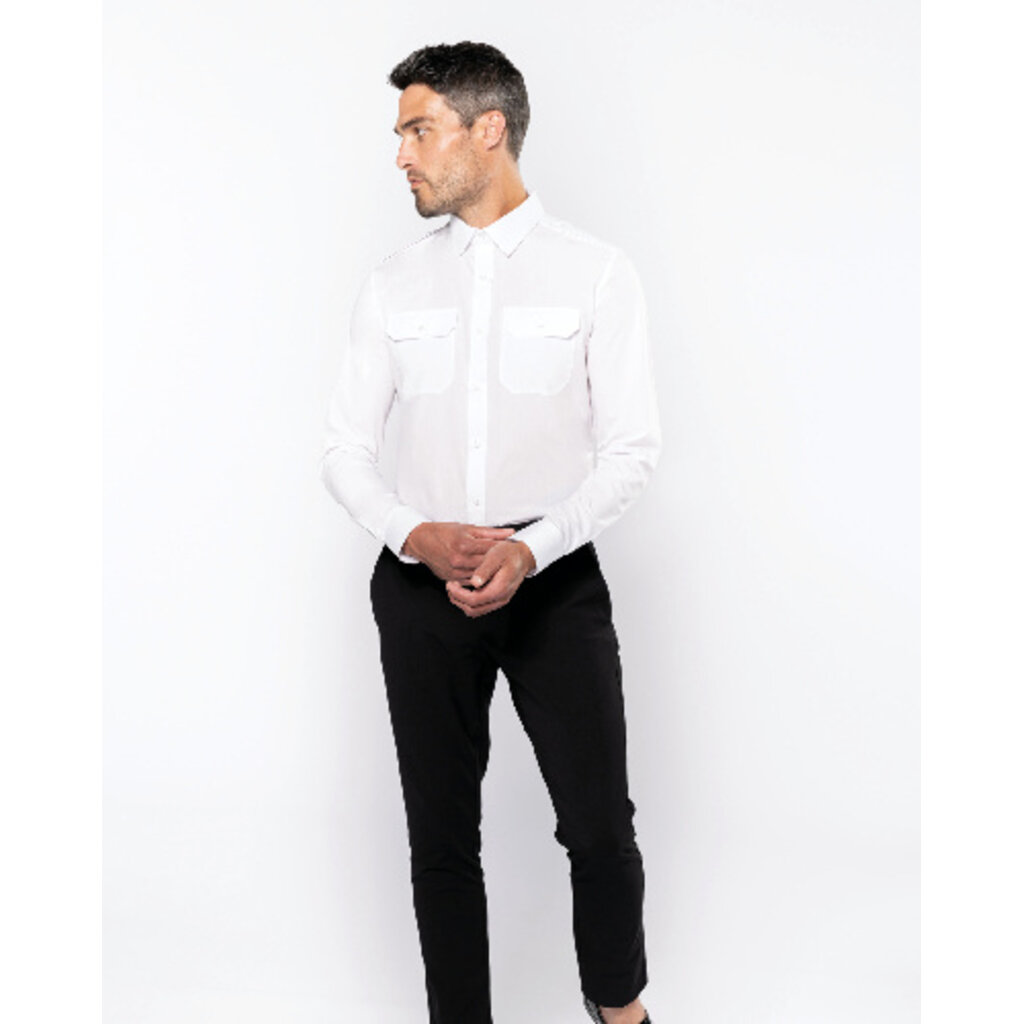 Kariban K505 herenoverhemd van popelinekatoen en polyester, verkrijgbaar in het wit en zacht blauw. Pilotenmodel met lange mouwen. Dit zakelijke overhemd is makkelijk in onderhoud (kreukt niet snel en laat zich makkelijk strijken) en dankzij de ruimteplooi is er tijdens het dragen altijd bewegingsvrijheid.