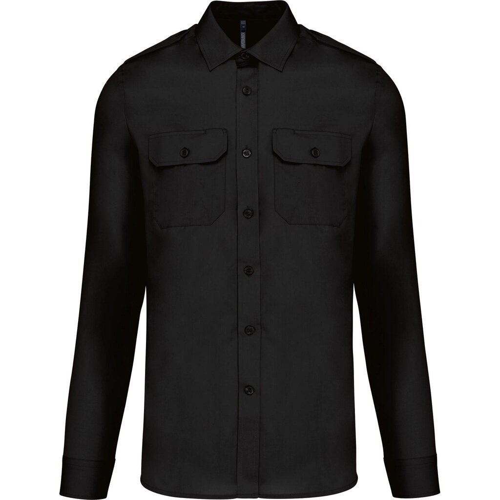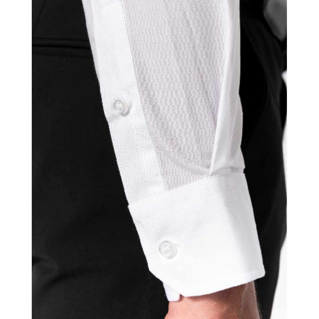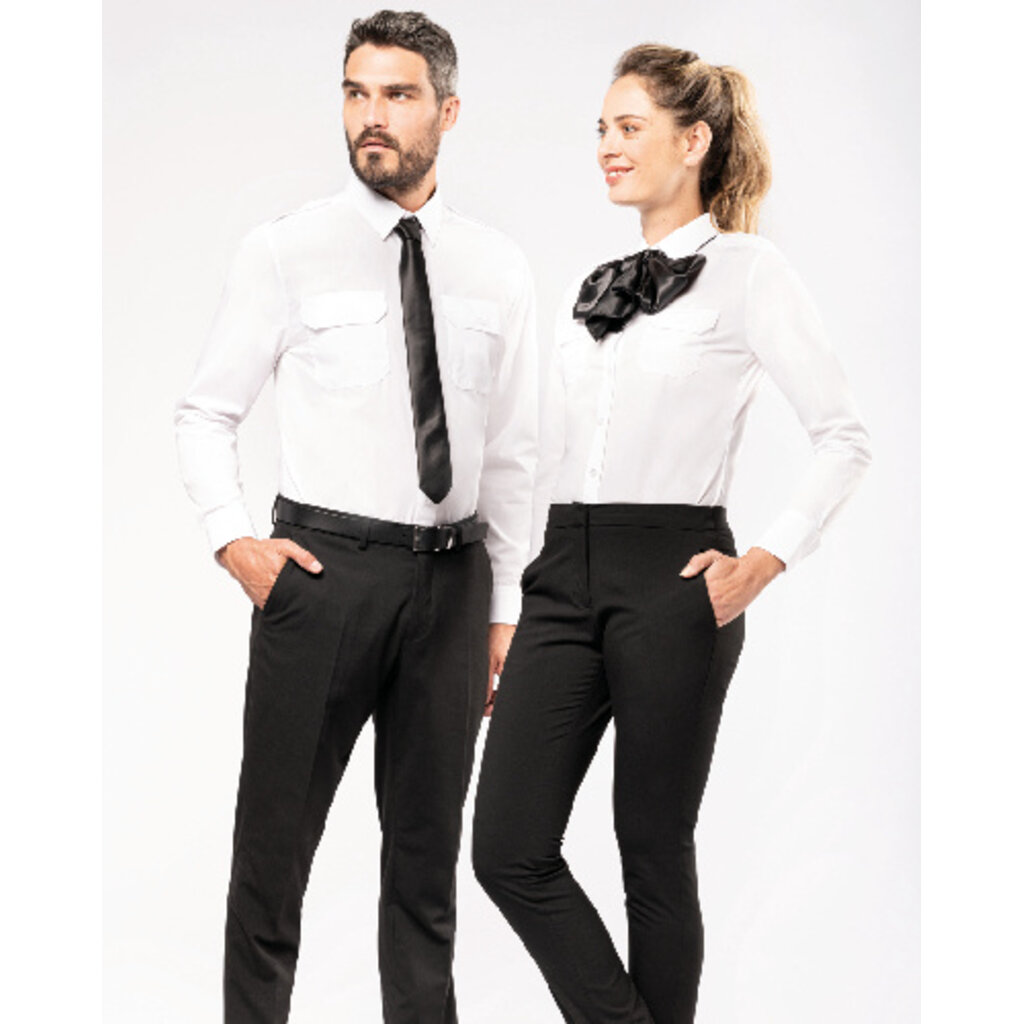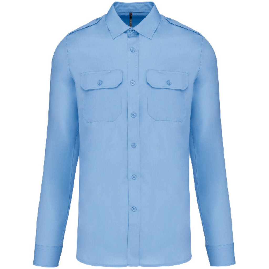 Kariban K505 herenoverhemd van popelinekatoen en polyester, verkrijgbaar in het wit en zacht blauw. Pilotenmodel met lange mouwen. Dit zakelijke overhemd is makkelijk in onderhoud (kreukt niet snel en laat zich makkelijk strijken) en dankzij de ruimteplooi is er tijdens het dragen altijd bewegingsvrijheid.