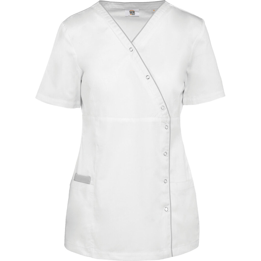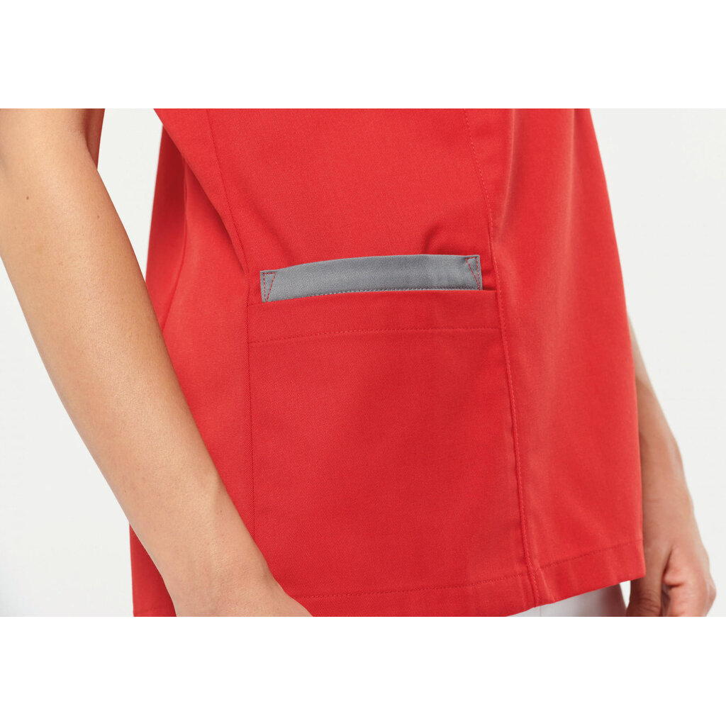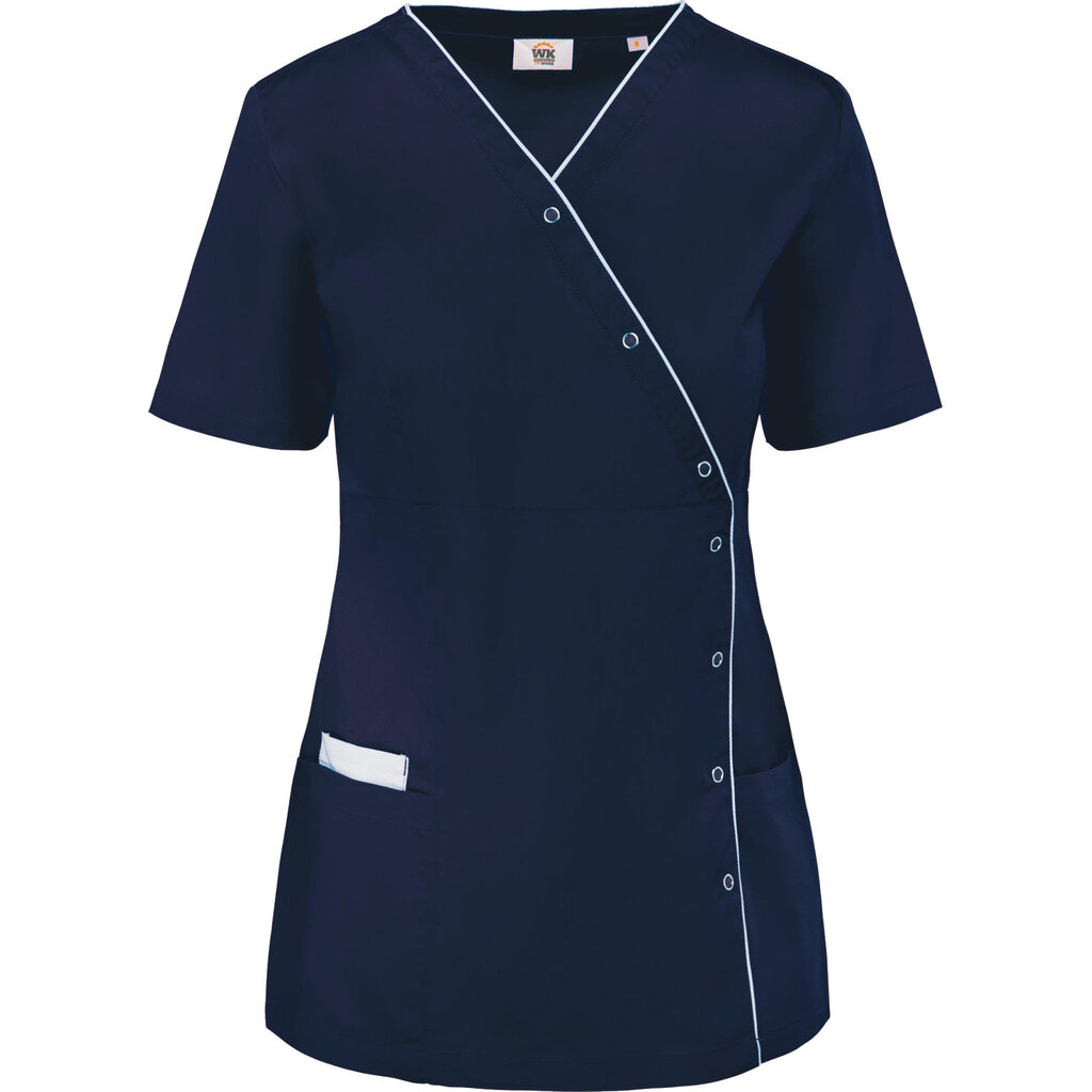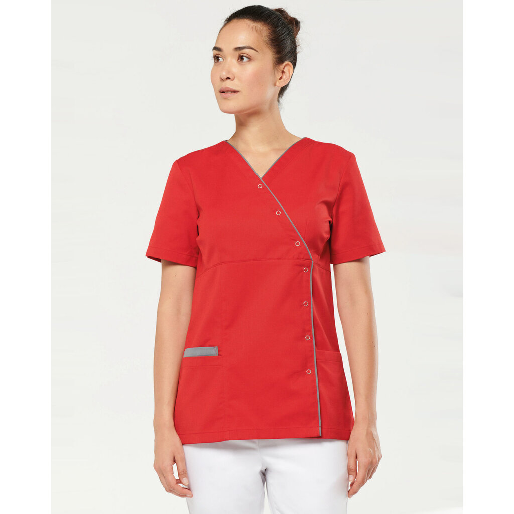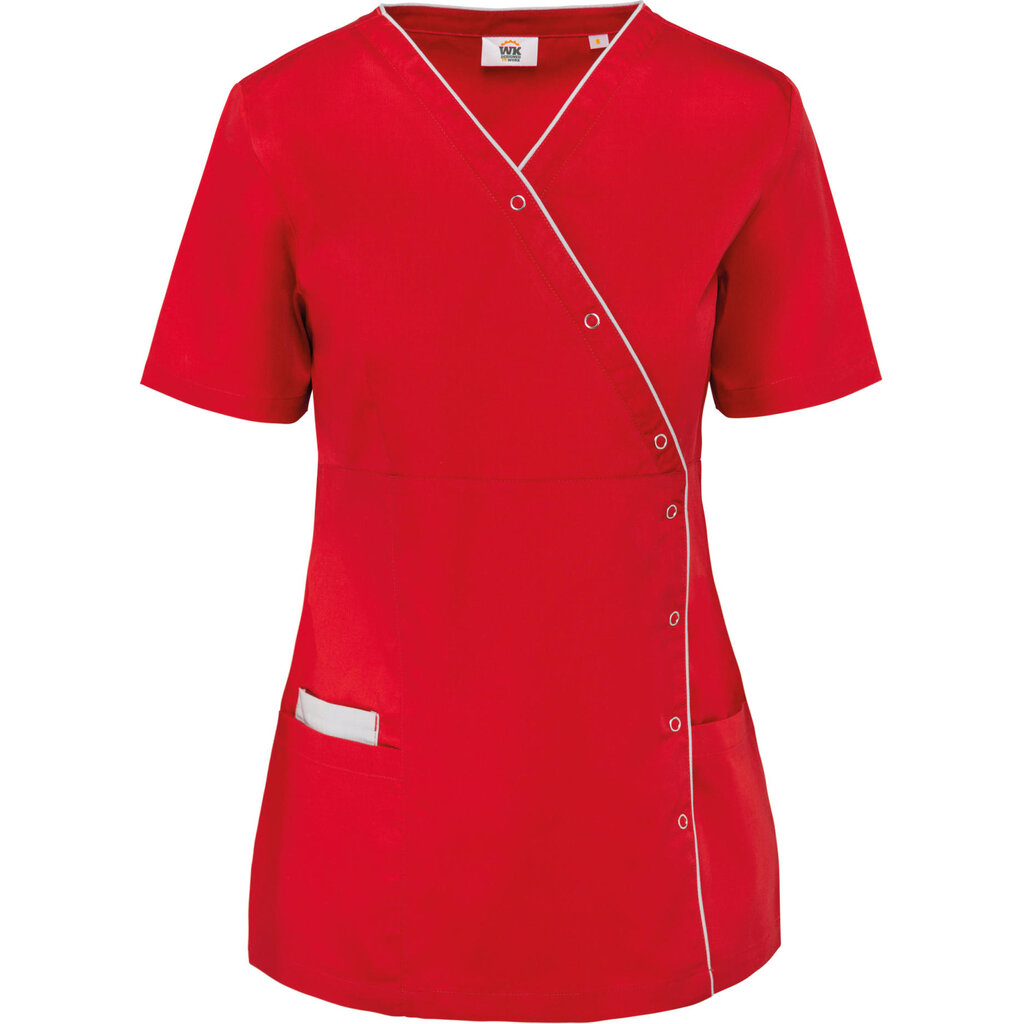 Model WK506 damesblouse van Kariban, in verschillende kleuren beschikbaar met V-hals en een contrastbies over de assymetrische sluiting. Gesneden in een een getailleerde pasvorm die de hele dag prettig zit, en door de drukknopen is hij makkelijk aan te trekken.