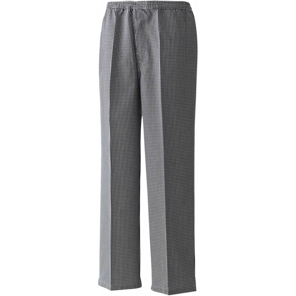 Een traditionele Koksbroek met elastische tailleband. Comfortabel en makkelijk aan te trekken. Klassieke zwart/wit/grijze blokjes patroon.