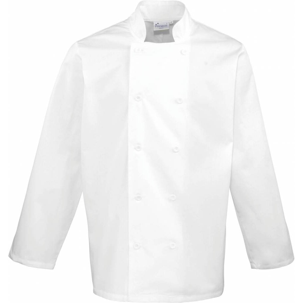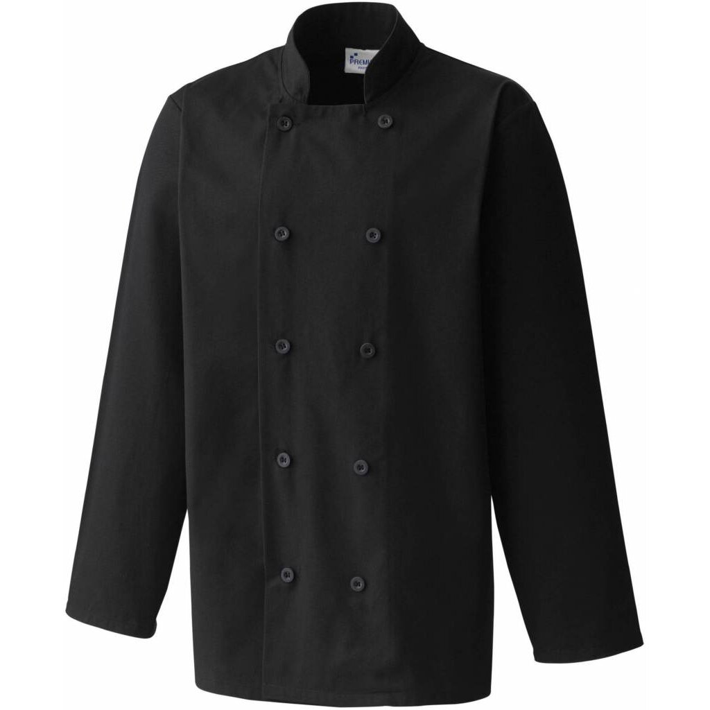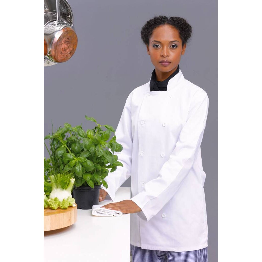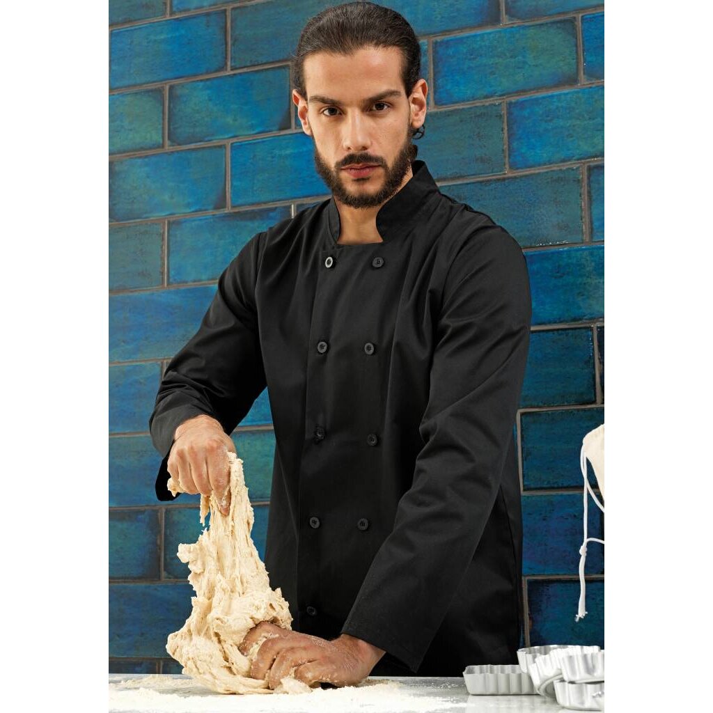 Unisex koksbuis met lange mouwen. Leverbaar in het zwart of wit. Op aanvraag ook in Steelblue leverbaar.