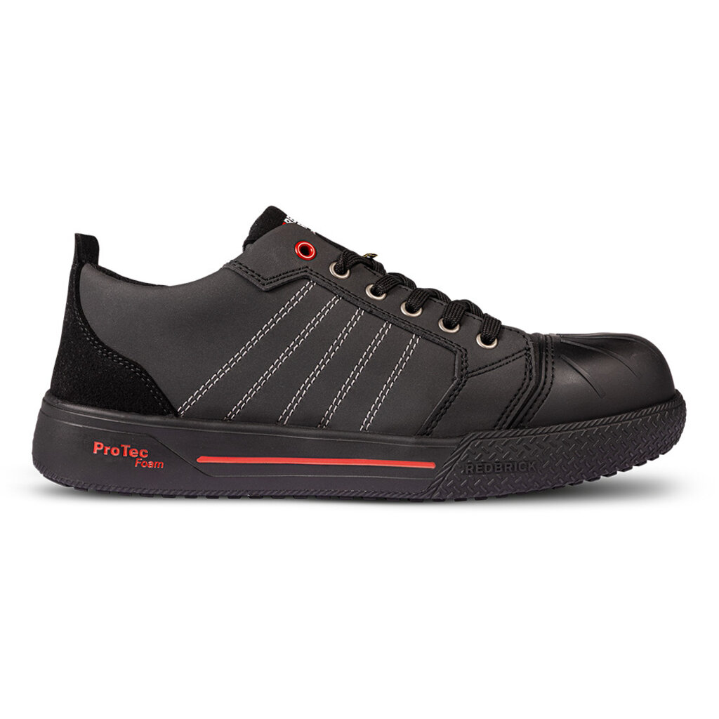 Lage leren werkschoenen van Redbrick model Champ Low. Deze sneaker combineert een strak, zwart design met een verstevigde kruipneus die de schoen extra slijtvast maakt. De S3S veiligheidsnormering garandeert optimale bescherming met een composiet neus en een metaalvrije tussenzool.