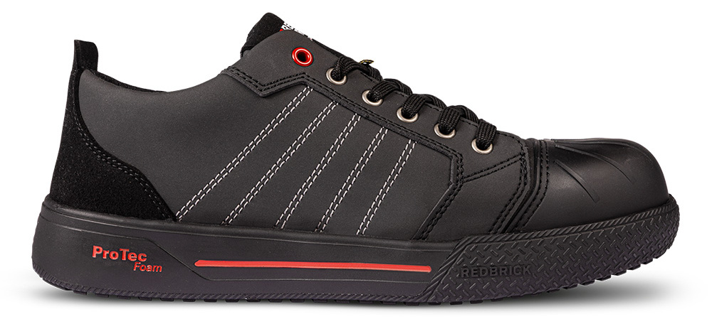 Grote aantallen nodig? Bestel direct of vraag eerst een offerte aan.Lage leren werkschoenen van Redbrick model Champ Low. Deze sneaker combineert een strak, zwart design met een verstevigde kruipneus die de schoen extra slijtvast maakt. De S3S veiligheidsnormering garandeert optimale bescherming met een composiet neus en een metaalvrije tussenzool.