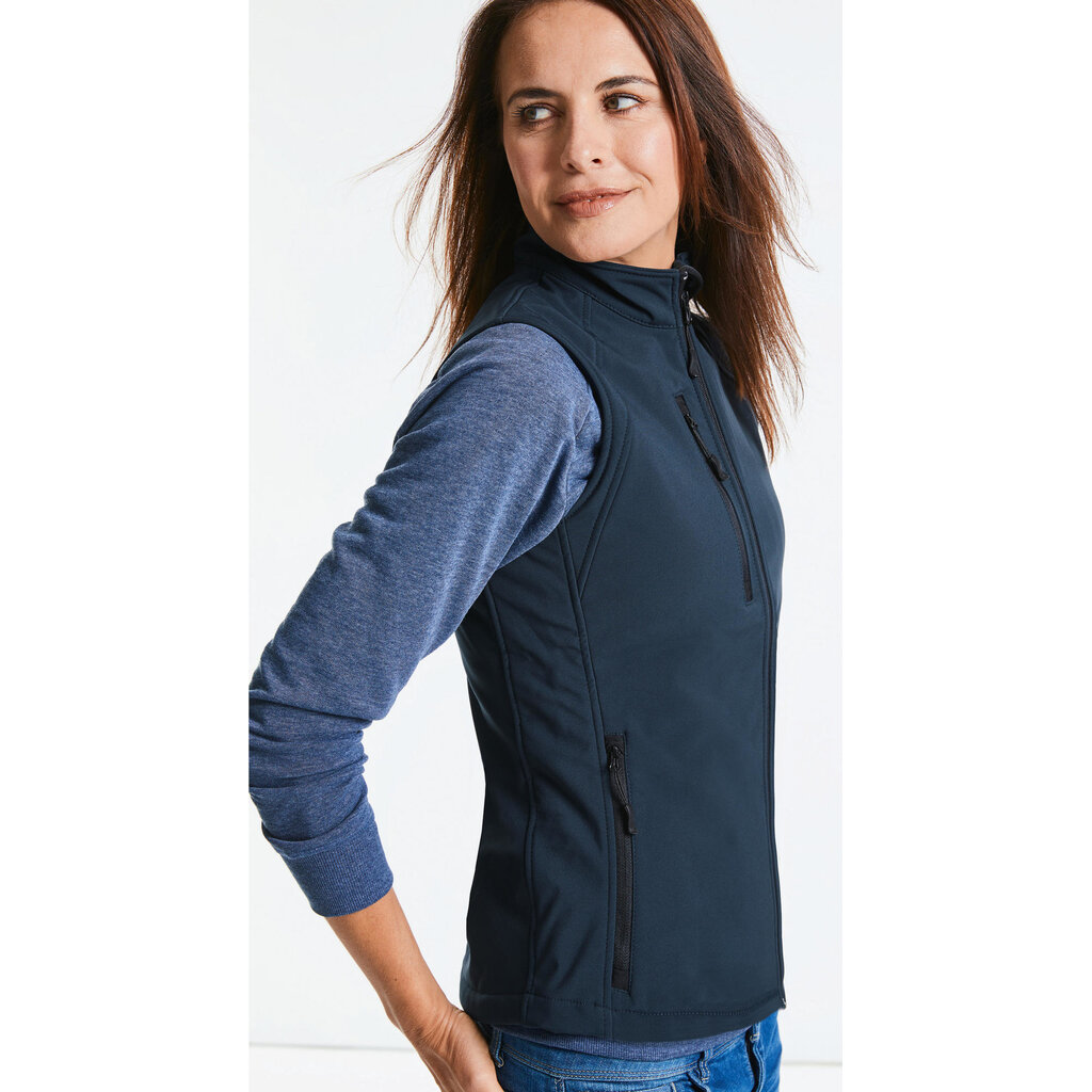 Deze comfortabele bodywarmer van Russell is gemaakt van softshell, een polyester stof die waterdicht en windbestendig is. De bodywarmer heeft twee zijzakken, een borstzak en een binnenzak, allemaal met rits. Onderaan zit een aanrijgsnoer, zodat je de bodywarmer kan aanpassen aan jouw lichaam. De volledige ritssluiting heeft een stormflap aan de binnenkant. Het achterpand van de bodywarmer is verlengd.