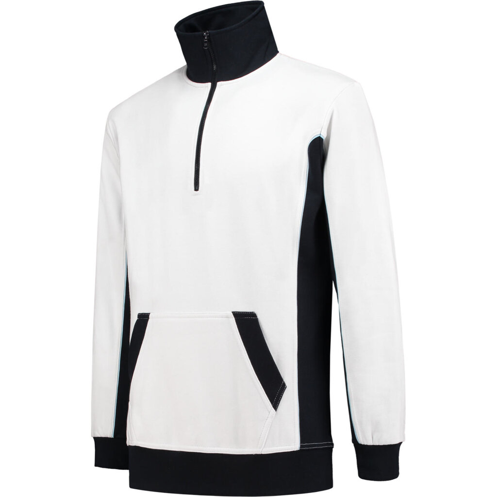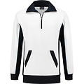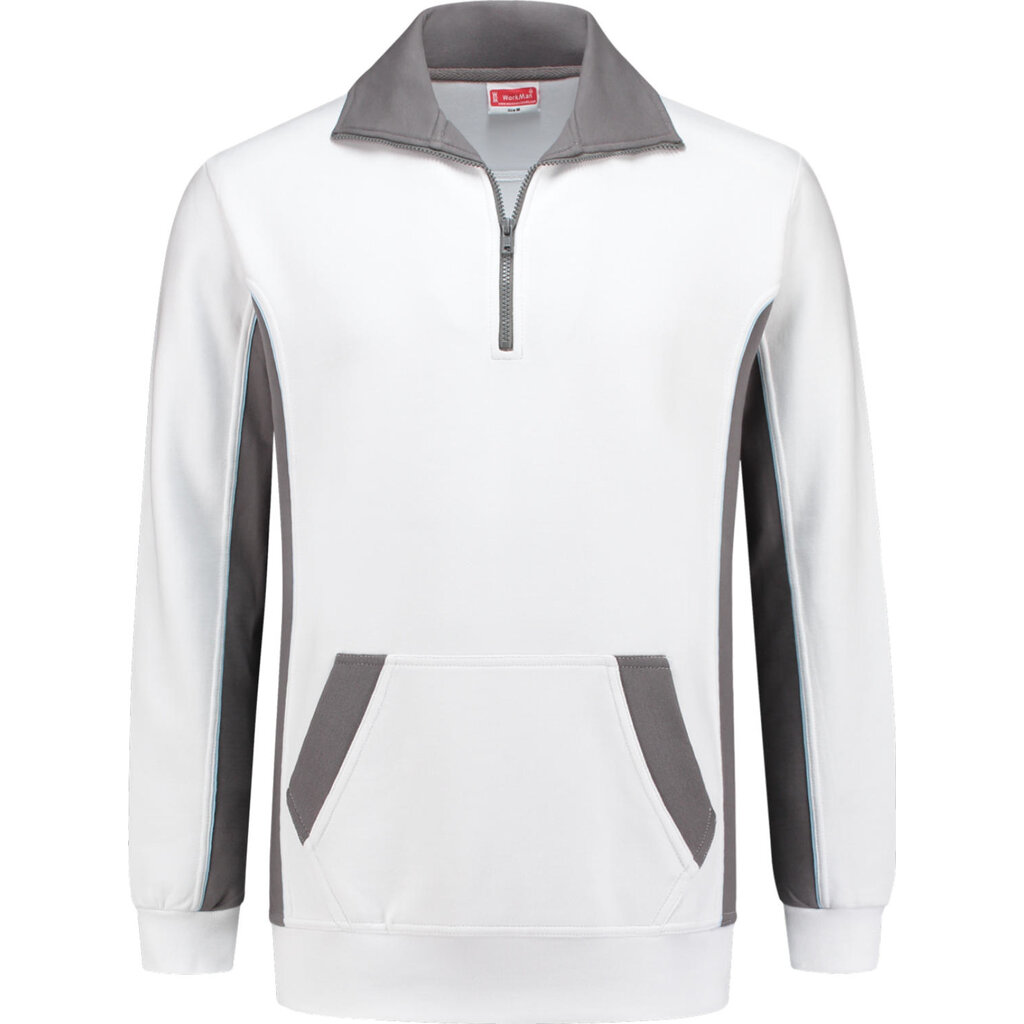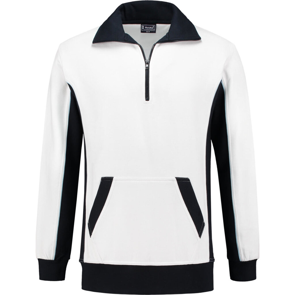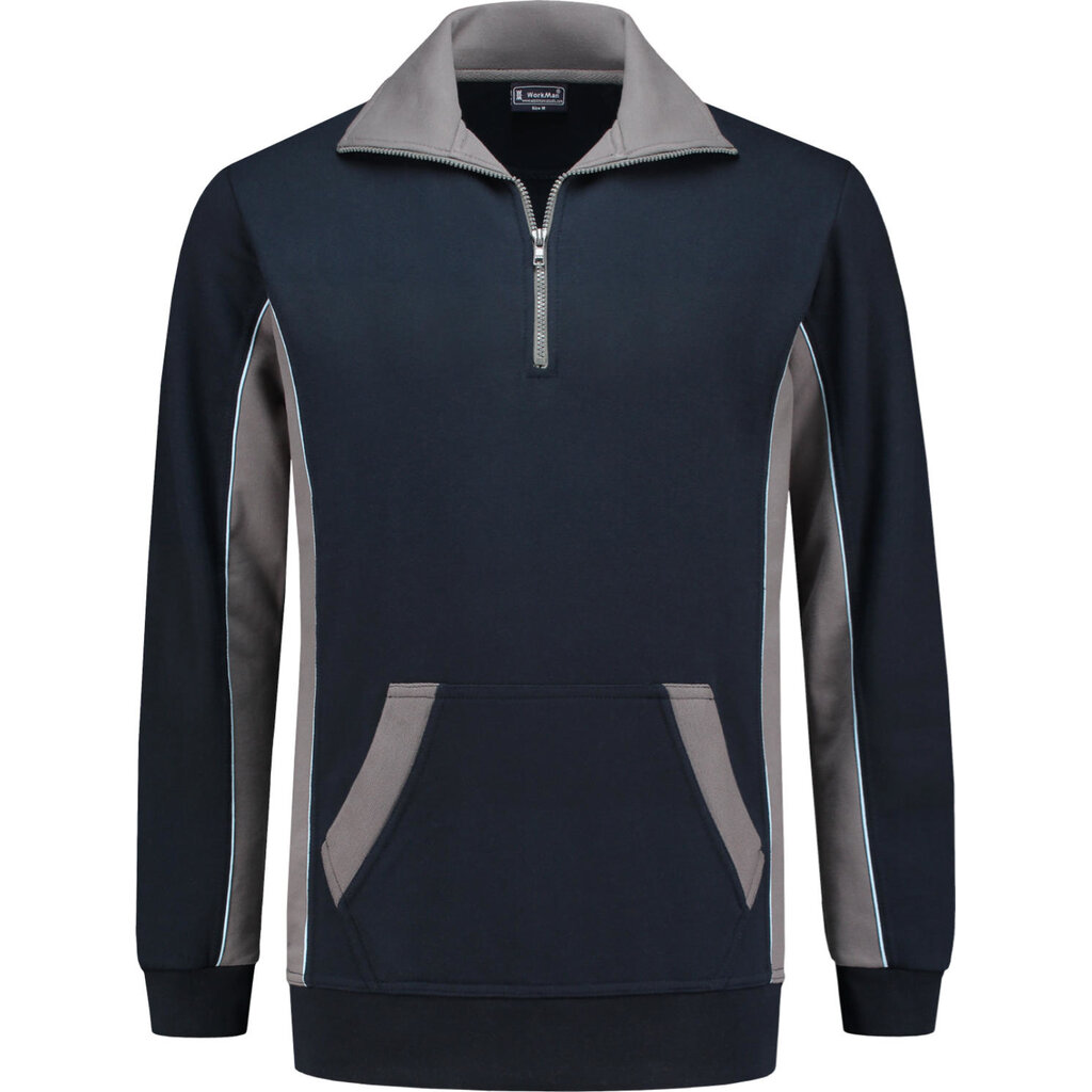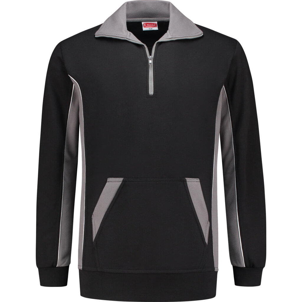 WorkMan sweater met korte ritssluiting, de welbekende en stevige YKK-rits. Deze sweater is uitgevoerd in verschillende kleurcombinaties, met contrastkleur op de binnenkant van de mouwen, de kraag, onderboord en de steekzakken. Deze zakken zijn van het type 'kangaroo' en lopen in elkaar over.